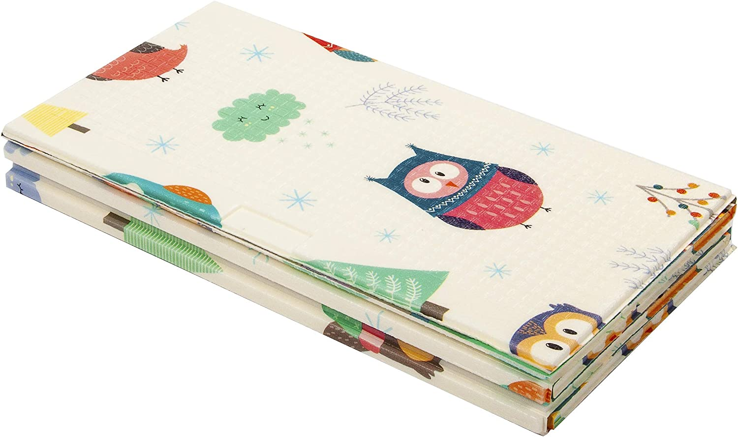 Double-sided design. Comes with two versions: Animals+Letters and Owls+Cities. Bright color and teaches basic recognition. Full dimensions: 58-inch x 77-inch, 0. 33-inch thick. Folding dimensions: 15. 4-inch x 28. 9-inch, 3. 74-inch thick