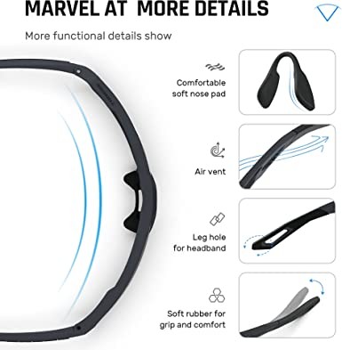 WE FOCUS ON YOUR COMFORT - 1. You don’t have to squint in direct sunlight with polarized sunglases. 2. Zero pressure around ears&nose because of soft rubber nose pad and flexible rubber temples. 3. Zero fogging issuses: good air flow around top, sides and bottom to prevent fogging from sweat. 4. These sunglasses are perfect with wrap, coverage, block light from the sides perfectly. 5. It is made to fit this snug on your face and you could do any activities, it will stay in place all the time...