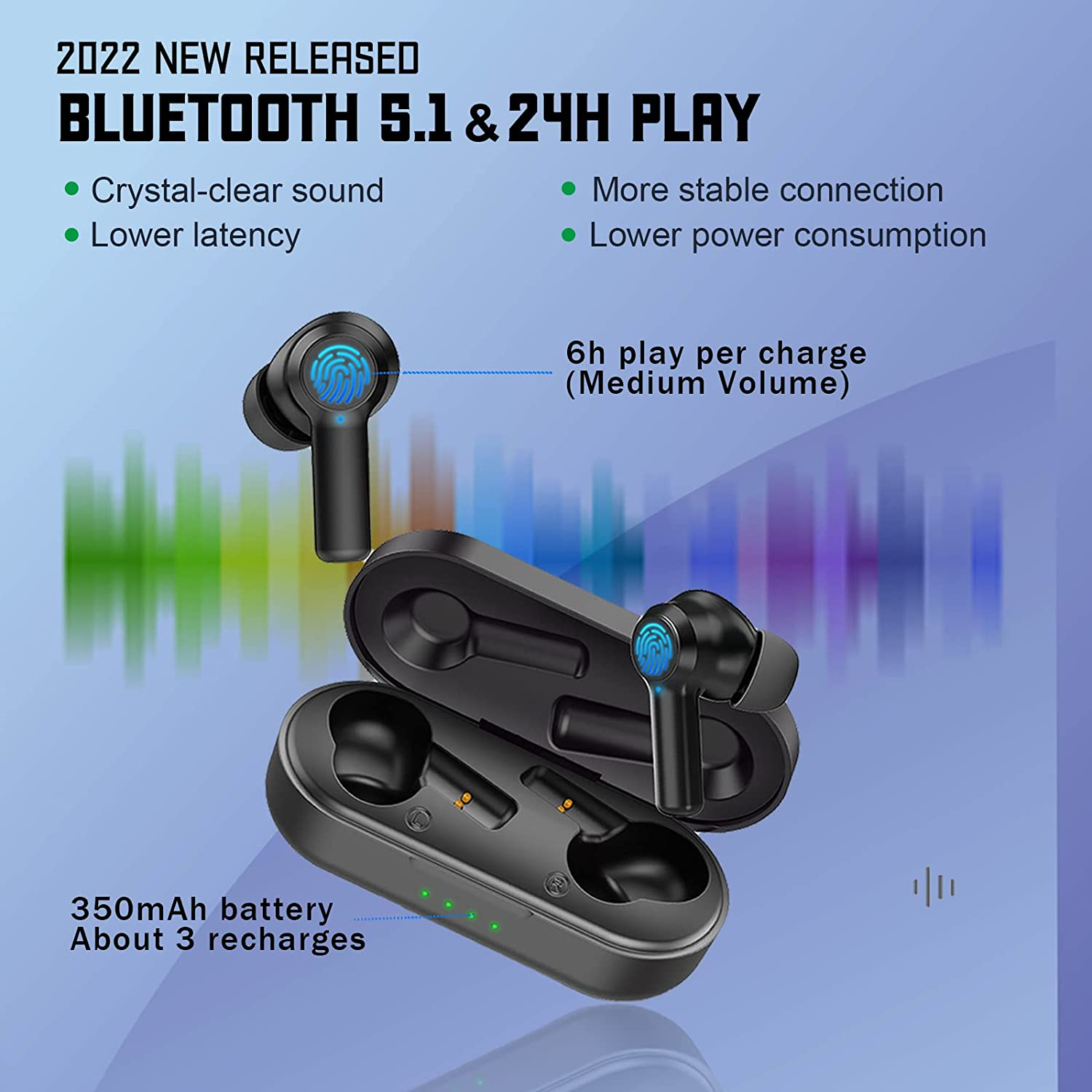 • All-day Long Playing: With large capacity battery and lower power consumption chip, the Bluetooth wireless ear buds can play about 6H (medium volume) per charge and with charging case, it can play up to 24H totally (the charging case can charge up the earbuds about 3 times). Using type-c fast charging, it takes about 1 hour to fully charge. The indicator on charging case will tell the power level clearly.